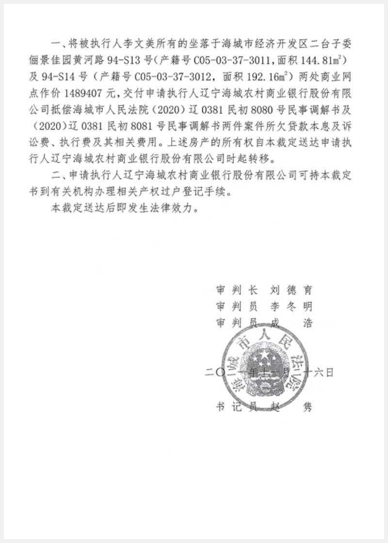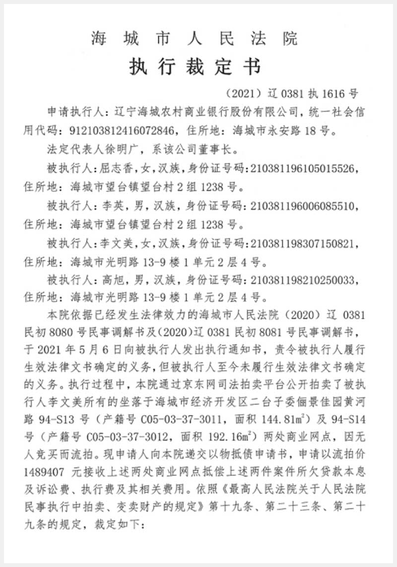 地址:海城經濟技術開發(fā)區(qū)二臺子委儷景佳園 標的號:187