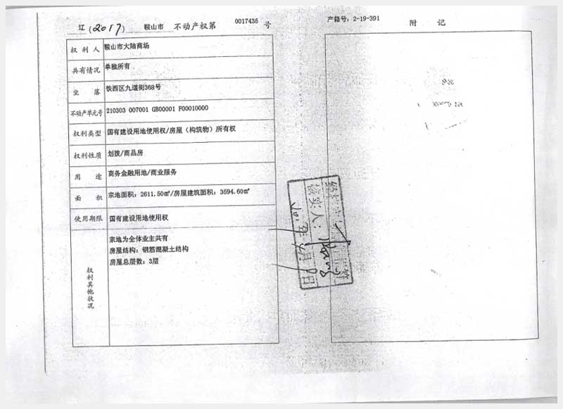 名稱:鞍山市鐵西區(qū)九道街368號房產(chǎn) 面積:3594.6㎡ 瀏覽次數(shù):1102