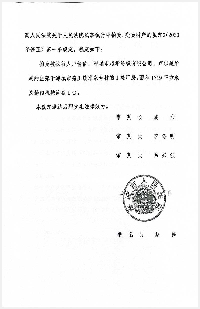 名稱:海城市感王鎮(zhèn)后鄧村房產(chǎn)、土地及機器設(shè)備 面積:房產(chǎn):10597.7㎡;土地:7338㎡;設(shè)備:1臺 瀏覽次數(shù):1163