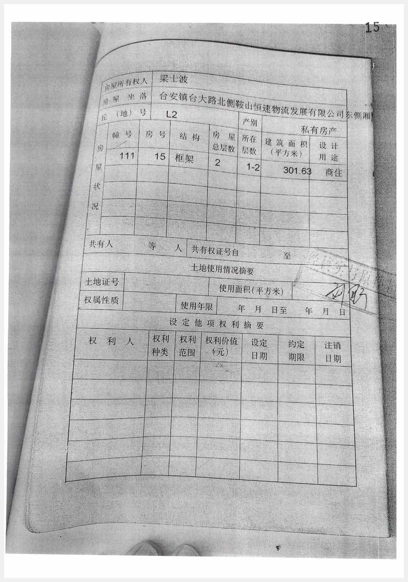 117號(hào) 臺(tái)安鎮(zhèn)臺(tái)大路北側(cè)鞍山恒速物流發(fā)展有限公司東側(cè)廂房南十五戶房產(chǎn)