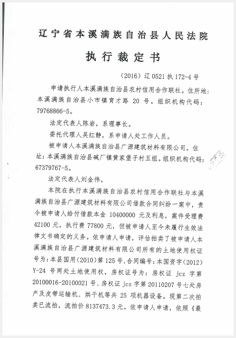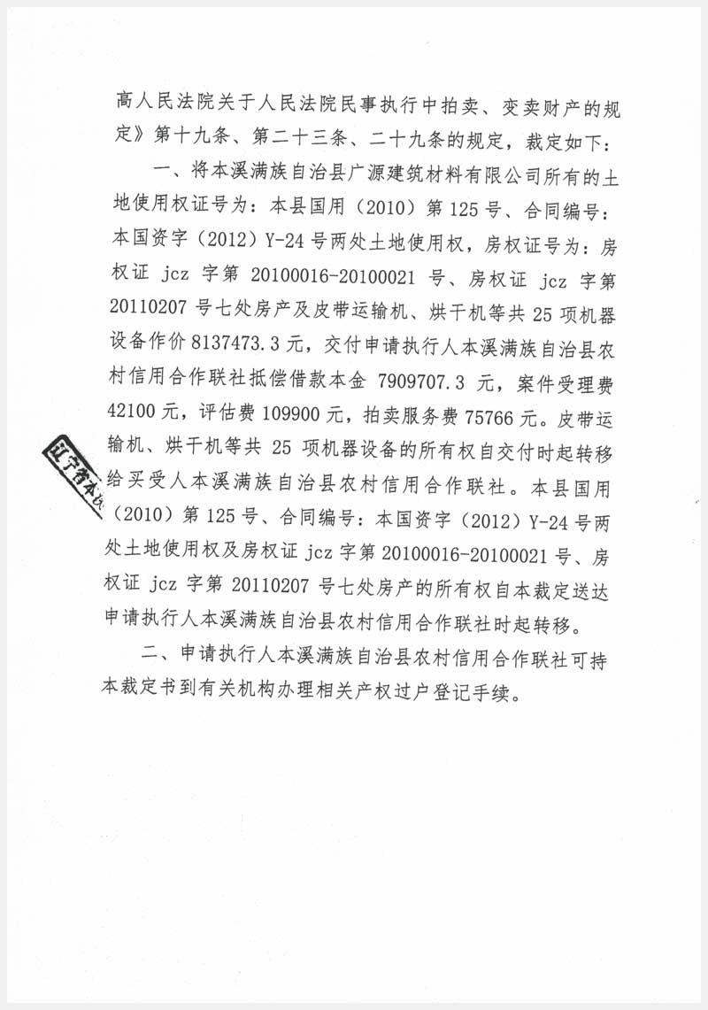 名稱:本溪縣堿廠鎮(zhèn)黃堡村房產(chǎn)7處、土地2處及設(shè)備25項(xiàng) 面積:房產(chǎn):3241.16㎡、土地:9290㎡ 瀏覽次數(shù):2010